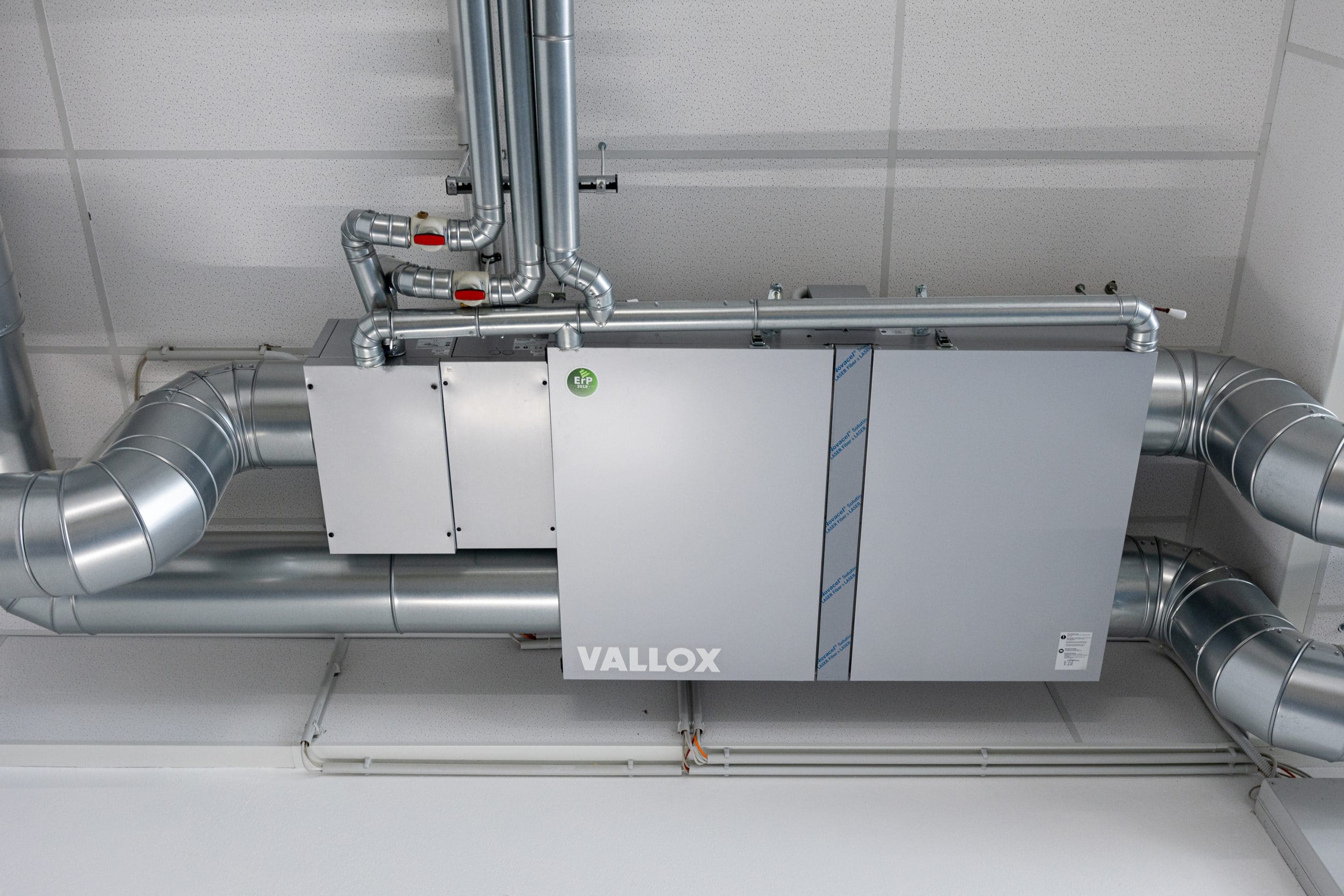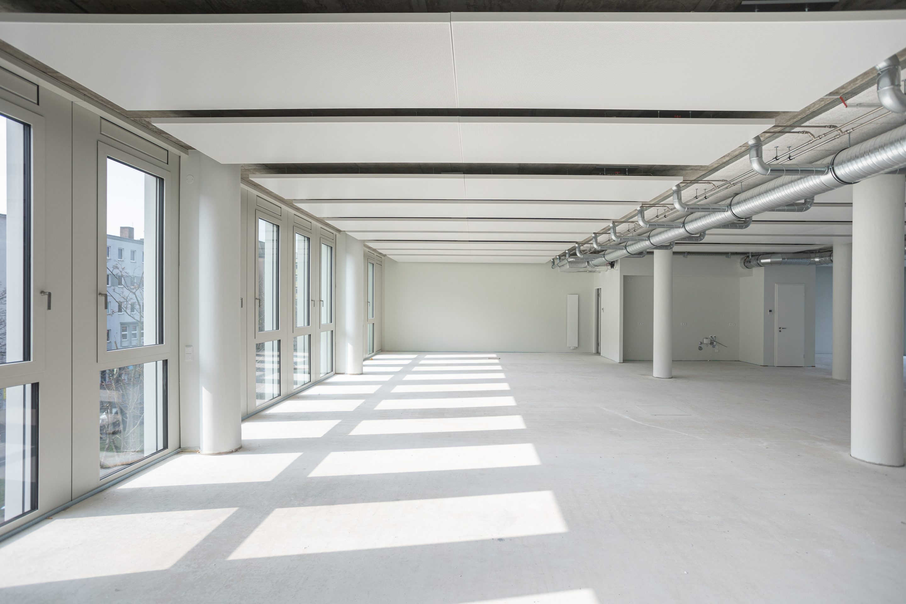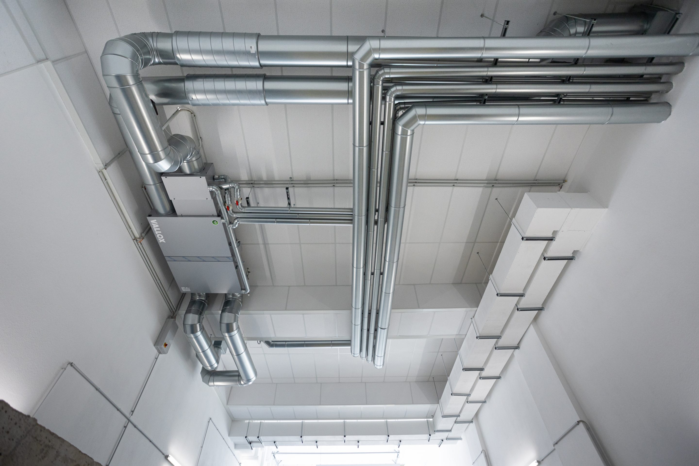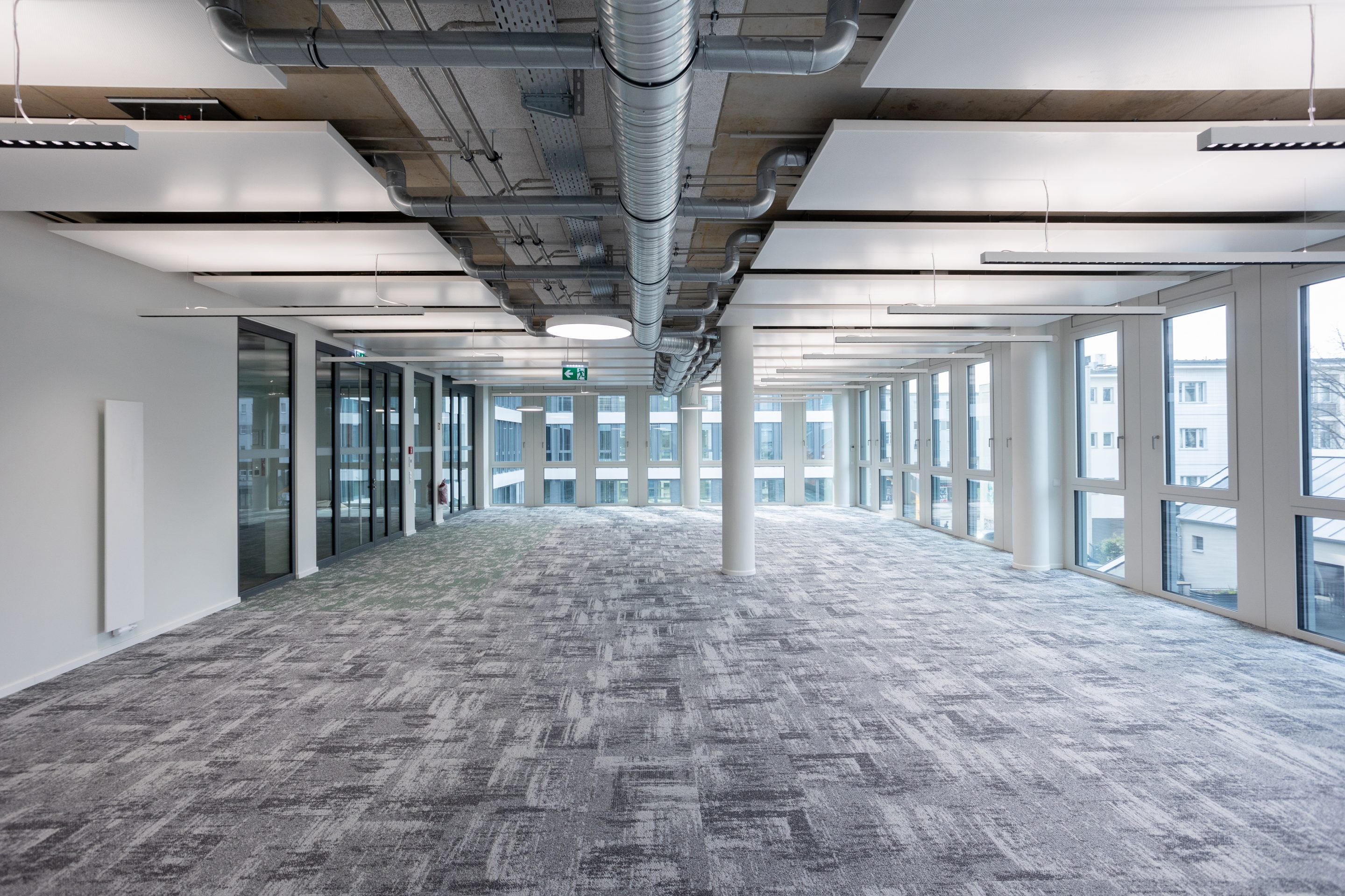 Die 25 zentralen VARIO Lüftungsgeräte mit Wärmerückgewinnung im Leistungsbereich von 600 bis 3.500 m³/h, die geschossweise als Deckengeräte eingebaut wurden ermöglichen eine individuelle Steuerung der Luftmenge pro Büroeinheit. Durch die Kombination mit Heiz- und Kühlsegeln, die mit Fernwärme betrieben werden, konnte eine energie- und betriebskosteneffiziente Lüftungslösung geschaffen werden, die ganzjährig für angenehmes Raumklima sorgt. Die sichtbare Montage der Lüftungstechnik erfüllt zudem den architektonischen Wunsch nach einem modernen Industrie-Look und unterstreicht die hochwertige Gebäudeausstattung.